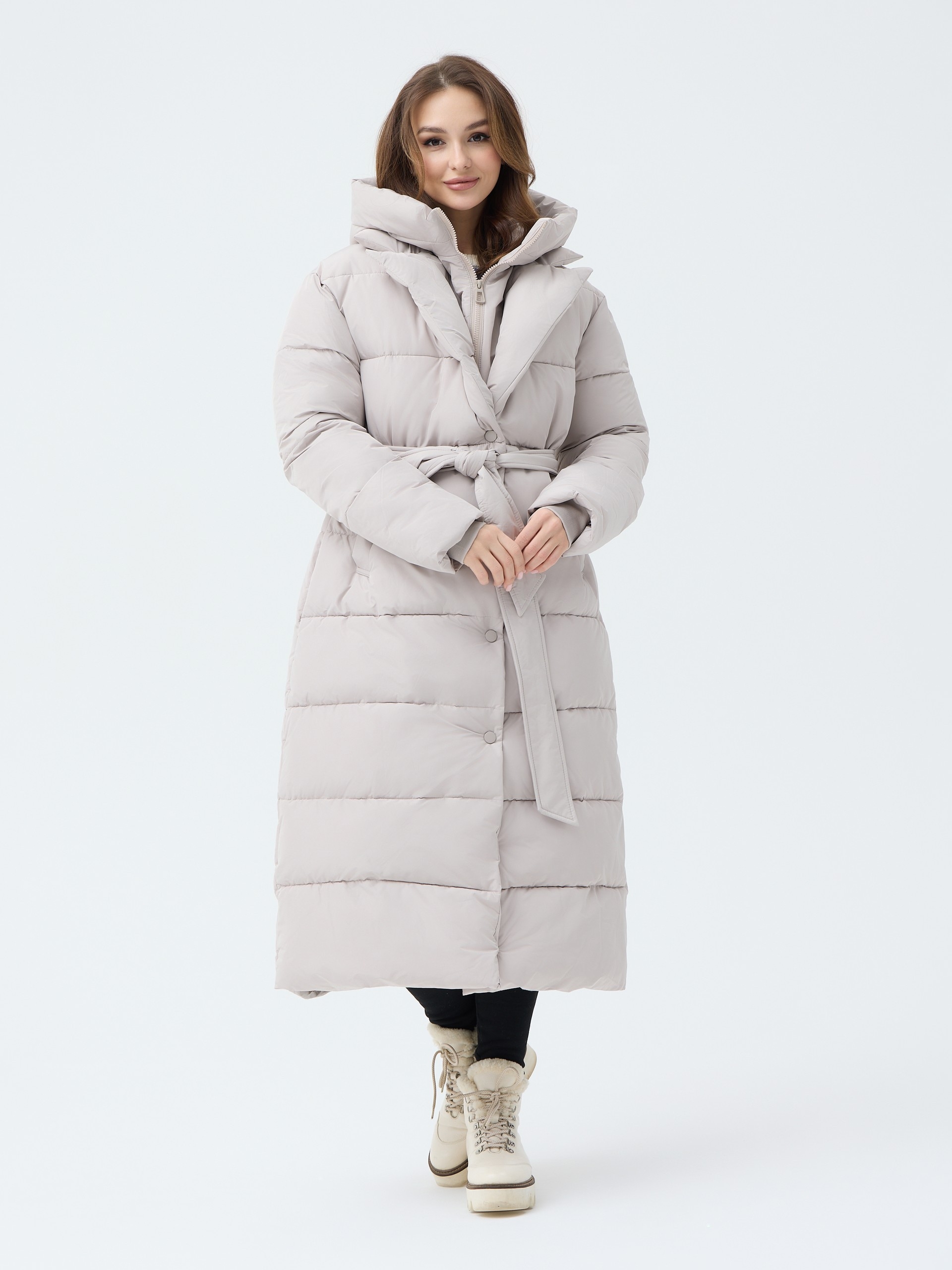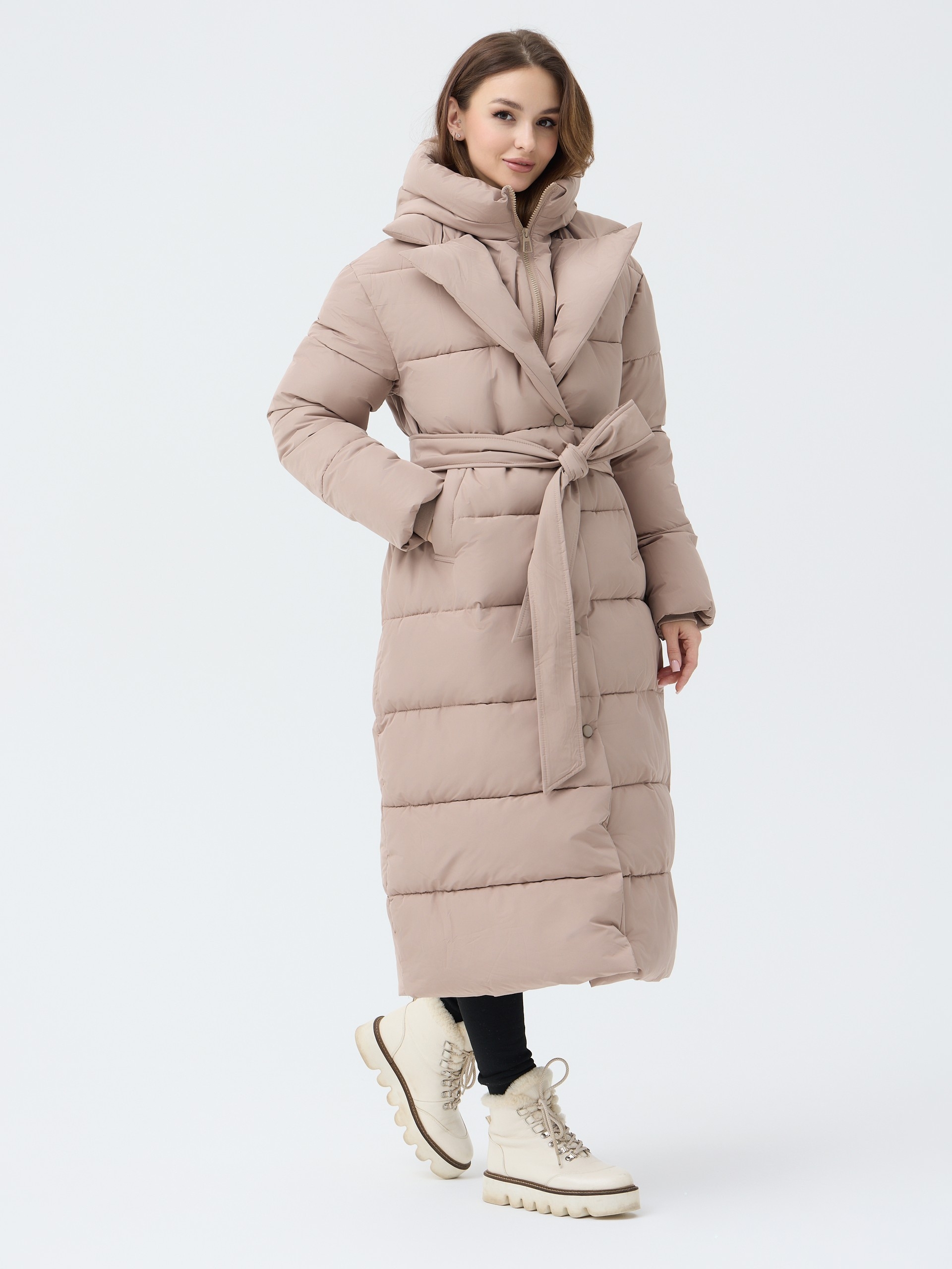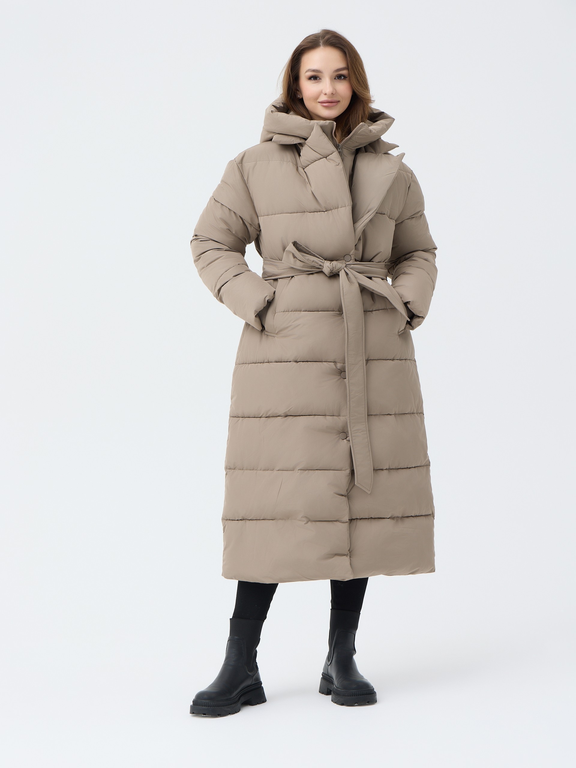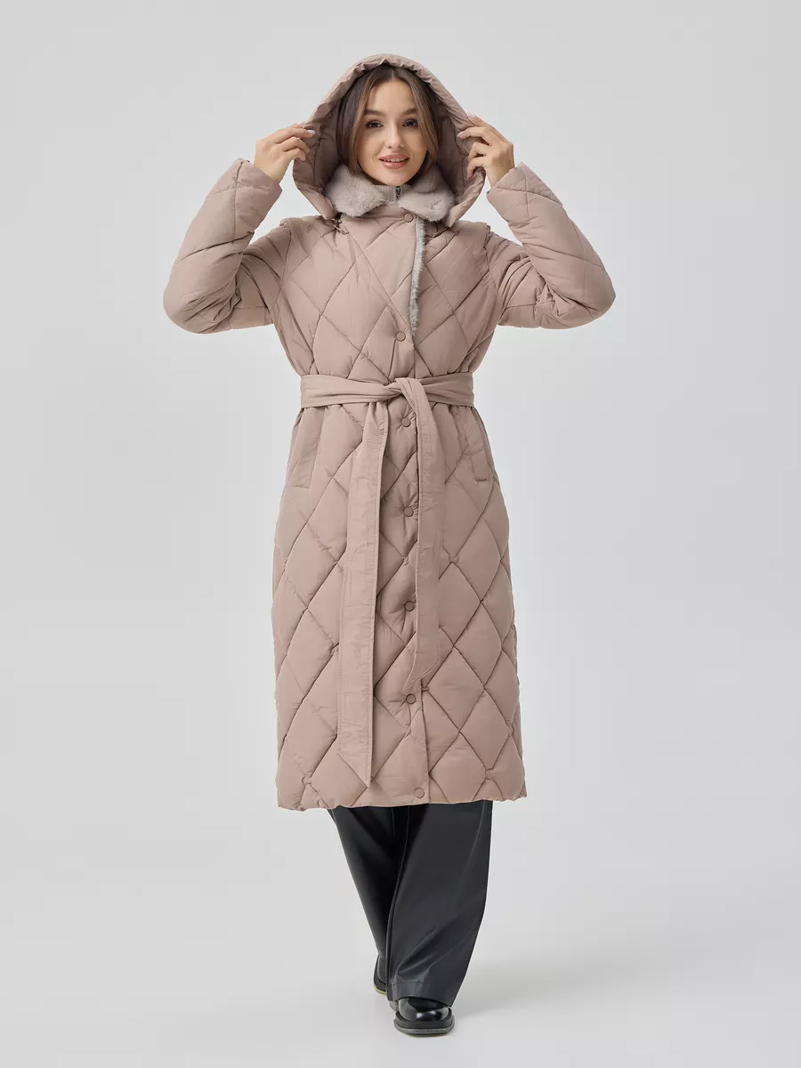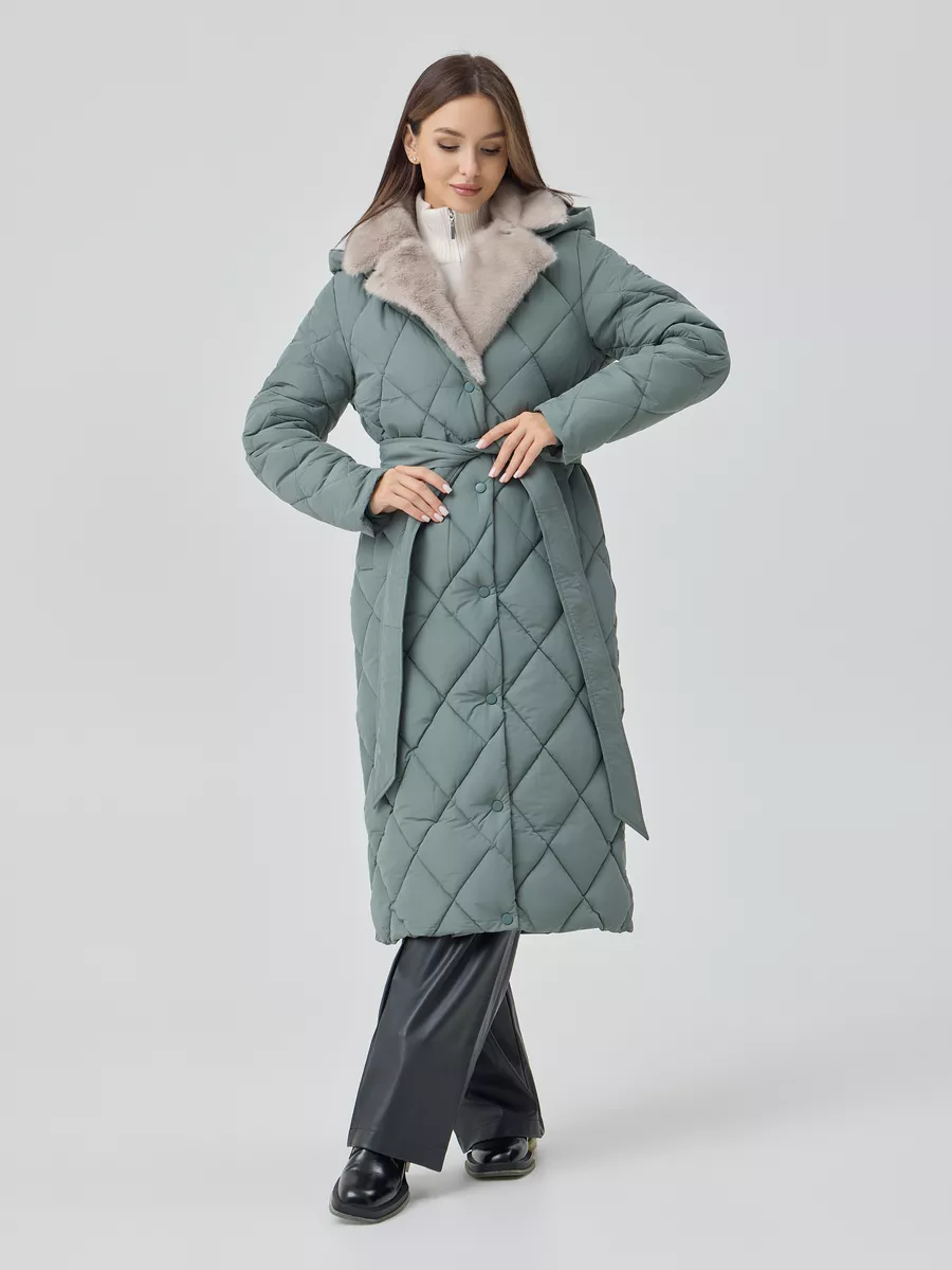 Особенности: матовая ткань, молния, кнопки, съемный капюшон, пояс, меховой воротник английского кроя