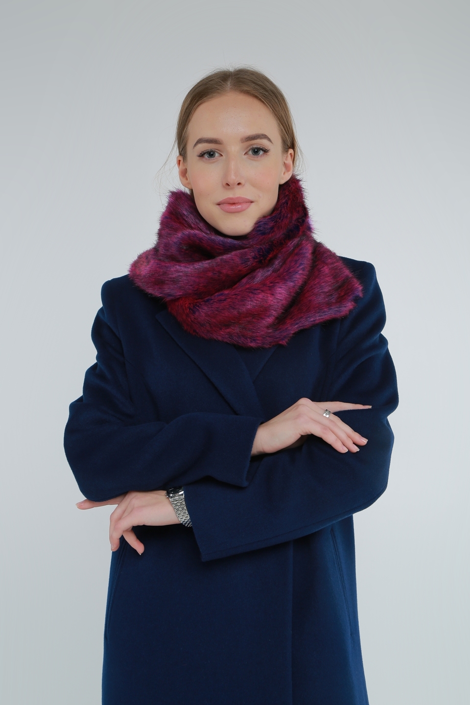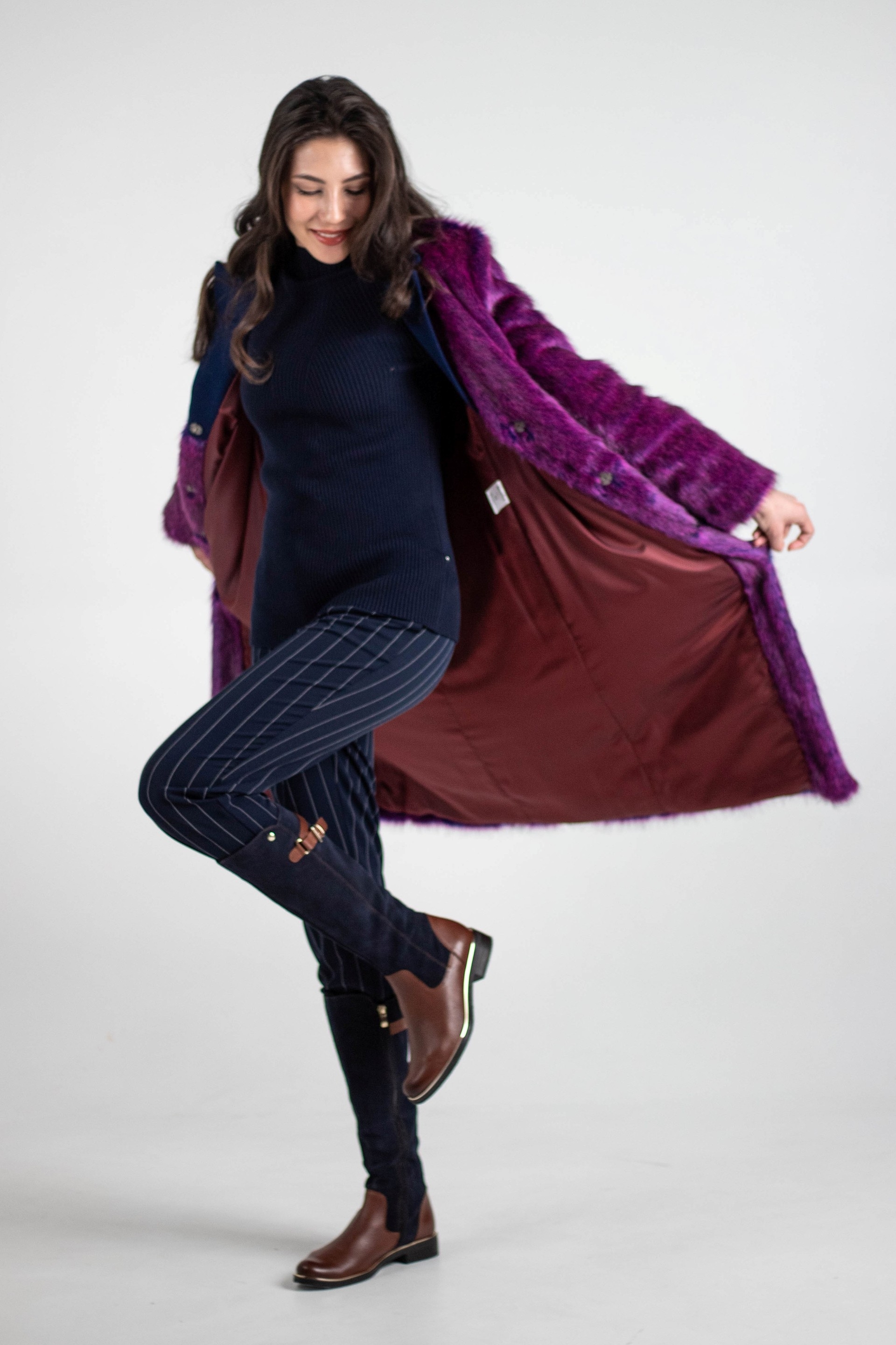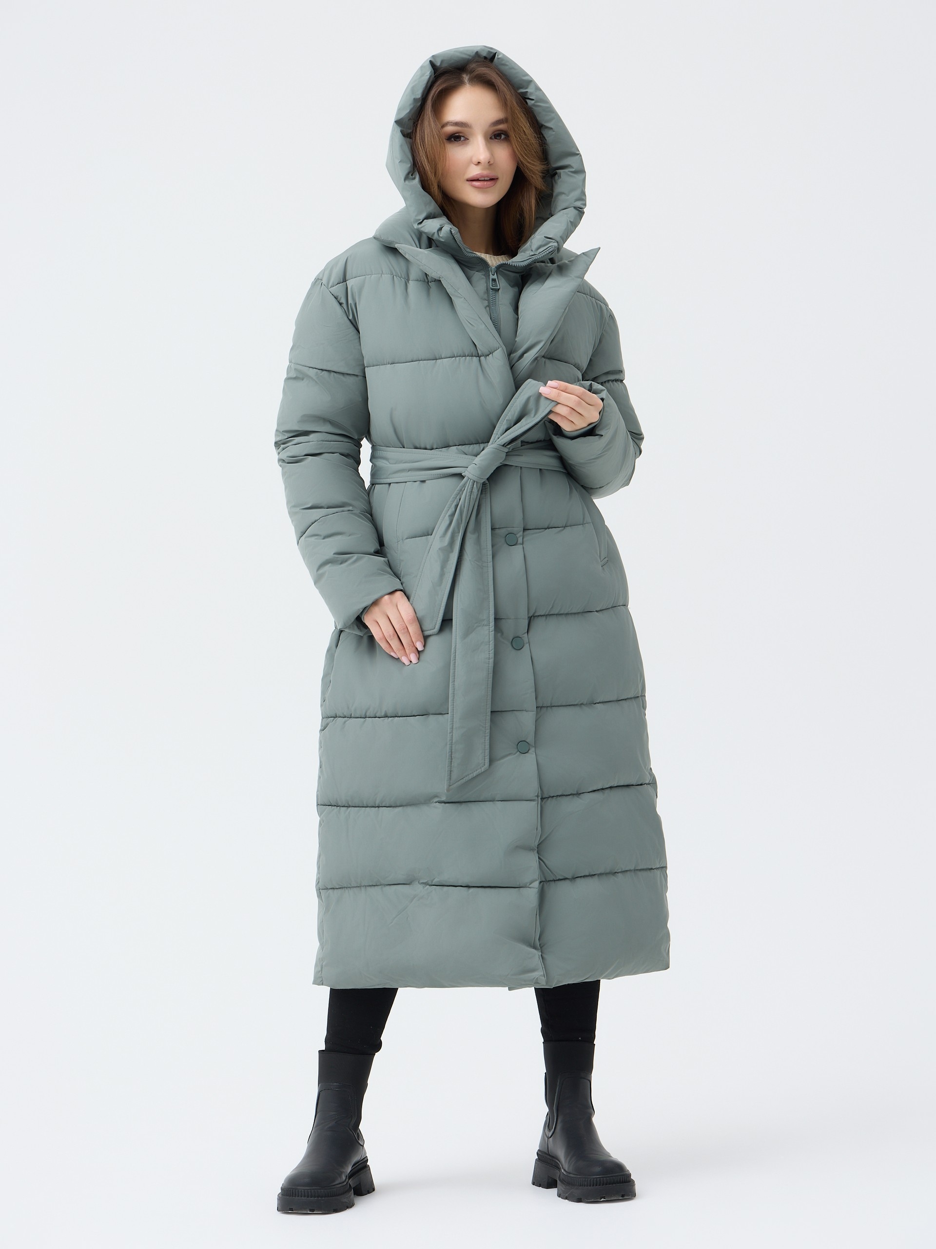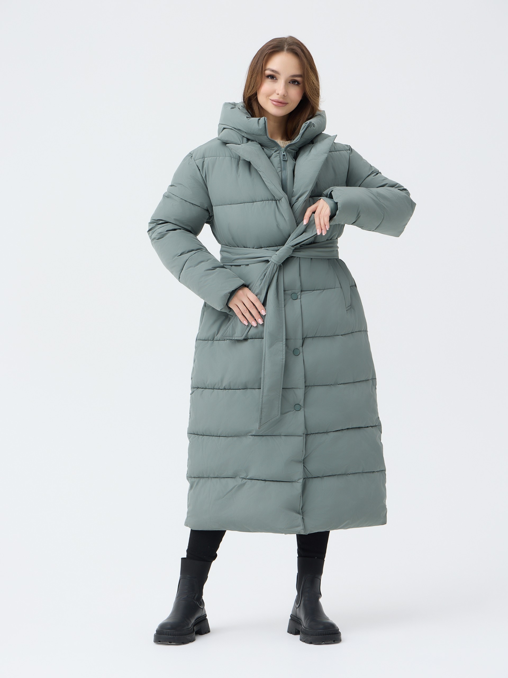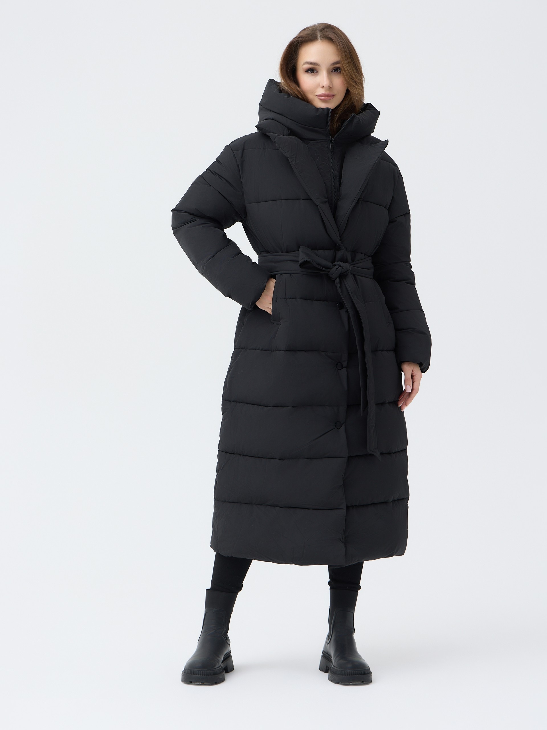 Особенности: матовая ткань, молния, кнопки, съемный капюшон, пояс, меховой воротник английского кроя
